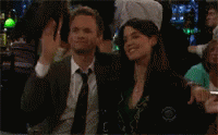Neil Patrick Harris (Barney Stinson) and a woman share an enthusiastic 'Hellyeah' high-five in a bar setting.