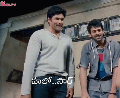 Prabhas smiles and greets, with the caption 'Hello Sir' visible, alongside another man.