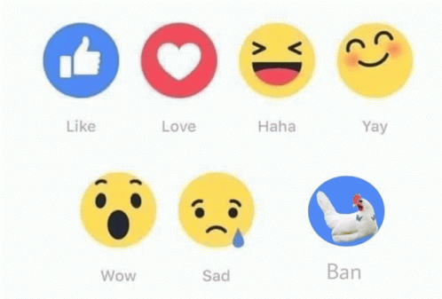 A collection of Facebook-style reaction emojis, featuring Like, Love, Haha, Wow, Sad, and a unique 'Ban' chicken emoji.