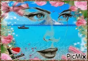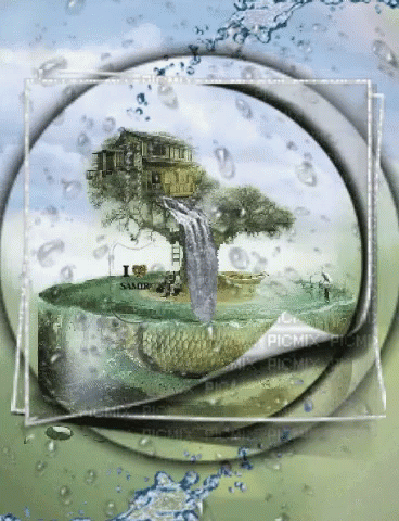A fantasy digital art piece featuring a treehouse with a waterfall on a fish-shaped island, with 'Hendaq Buon Giorno' theme.