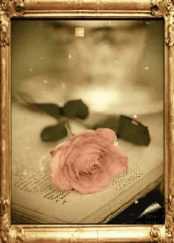 A framed picture featuring a pink rose resting on an open book, conveying a good morning sentiment.