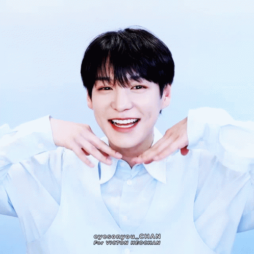 VICTON's Heochan smiles brightly at the camera, making a cute pose with his hands near his face.