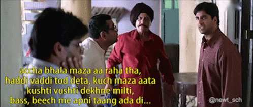 Akshay Kumar and friends in a scene from Hera Pheri, discussing someone interfering with their fun, saying 'Beech Me Taang Ada Di'.
