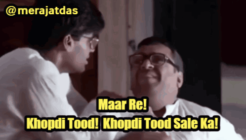 Iconic scene from Hera Pheri featuring Paresh Rawal, shouting 'Maar Re! Khopdi Tood! Khopdi Tood Sale Ka!' meme.