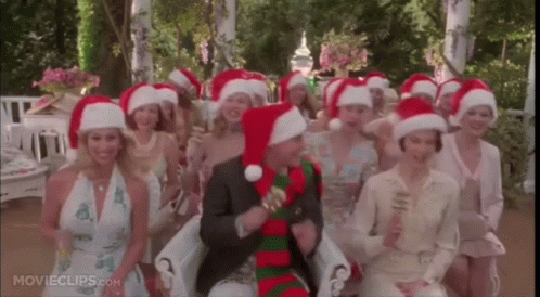 The Stepford Wives sing 'Here Comes Santa Claus' in Santa hats during a festive gathering.