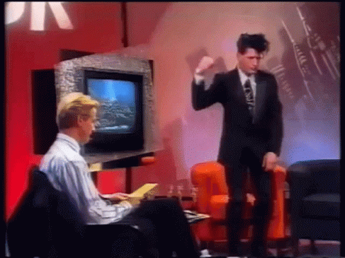 Herman Brood on a TV show, gesturing energetically while the phrase 'Kom maar op' (Bring it on) appears on screen.