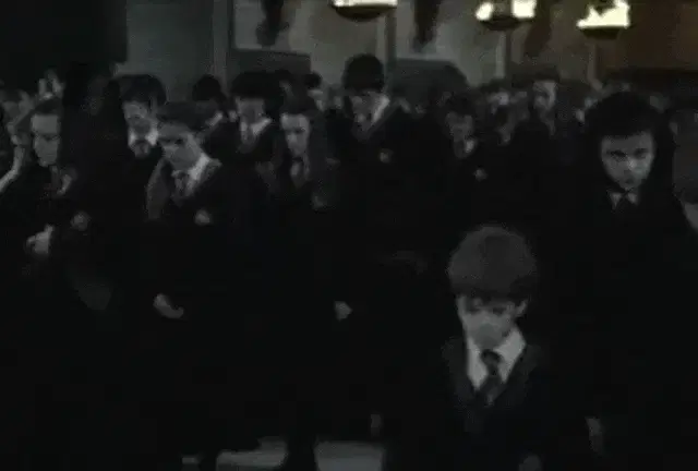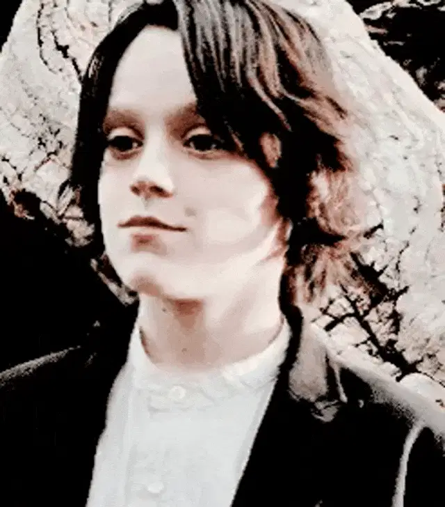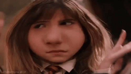 Hermione Granger from Harry Potter making a funny face with her hair blowing in the wind, a playful moment.
