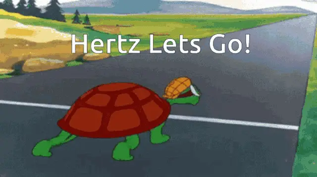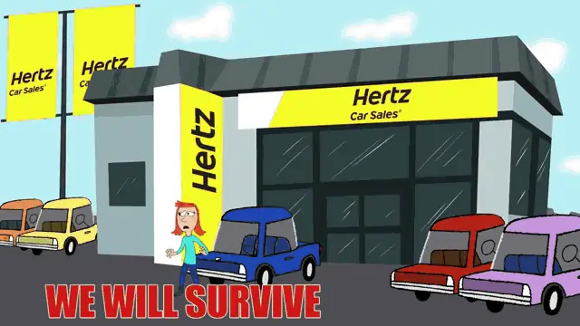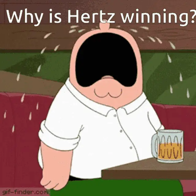 A woman walks past a Hertz Plug-in Hybrid car on a busy city street with billboards, as the text 'Lets Go!' appears.