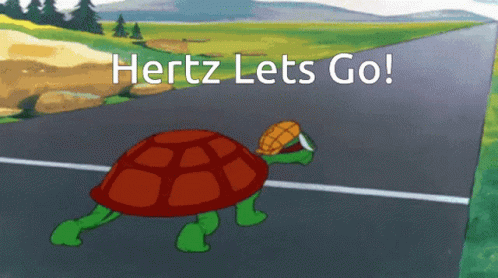 A cartoon turtle, initially slow, speeds up with rockets from its shell, racing down a road with 'Hertz Lets Go!' text.