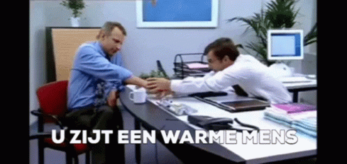 Two men, including Guido from "Het Eiland", interact at an office desk with the caption "U ZIJT EEN WARME MENS".