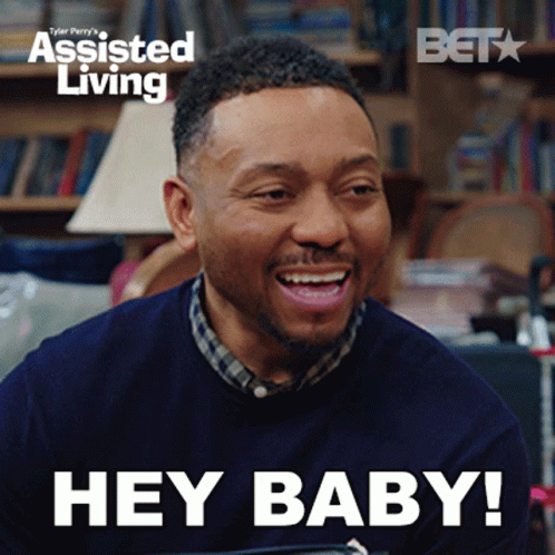 Jeremy from Tyler Perry's Assisted Living smiling and enthusiastically saying 'Hey Baby!'.
