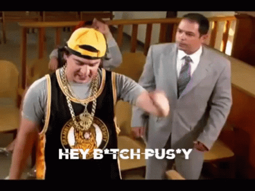 Man in a jersey with 'Hey Bitch Pussy' text, shouting and causing a scene in a courtroom.