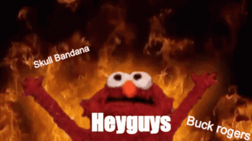 Elmo surrounded by flames, with text 'Heyguys', 'Skull Bandana', 'Helmet', 'Gas mask', and 'Buck rogers' in a meme.