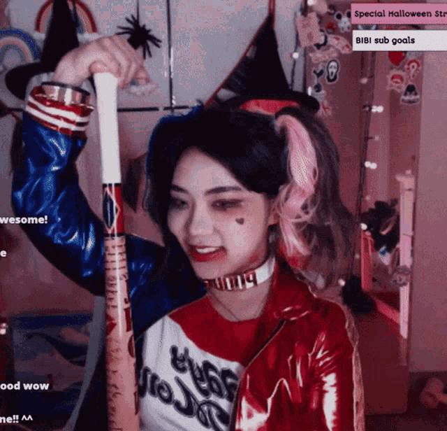 Heybbibbi Bbibbi in her Harley Quinn Halloween costume, holding a baseball bat and smiling.