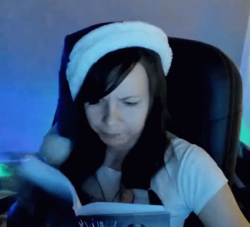 Heyimtey, the streamer, wearing a white Santa hat, reads a book and looks up at the camera.