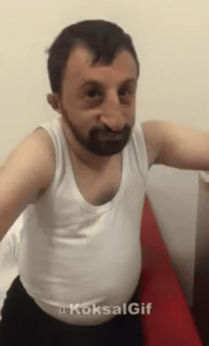 Internet personality Köksal Baba waves hello and blows a kiss to the camera, wearing a white tank top.