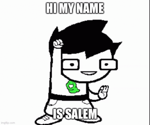 A black and white cartoon character introduces himself with the text 'Hi My Name Is Salem'.