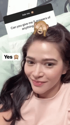A woman smiles and raises an eyebrow, responding to an 'Ask me' prompt with 'Yes' and a monkey emoji.