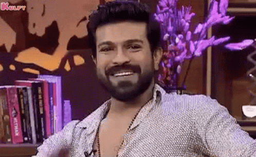 Ram Charan smiles and waves, greeting viewers with a namaste gesture in a vibrant setting.
