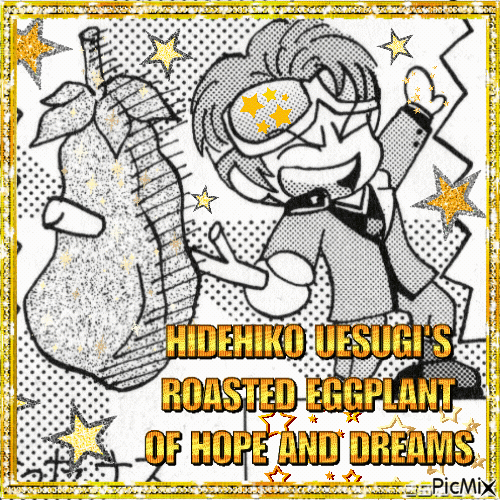 hidehiko sticks out an eggplant on a stick, smiling widely as the text, '"hidehiko uesugi's roasted eggplant of hope and dreams" glimmers beneath him.