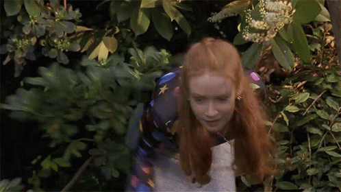 Two girls, one with long red hair, are seen hiding and running away through dense bushes, possibly spying.
