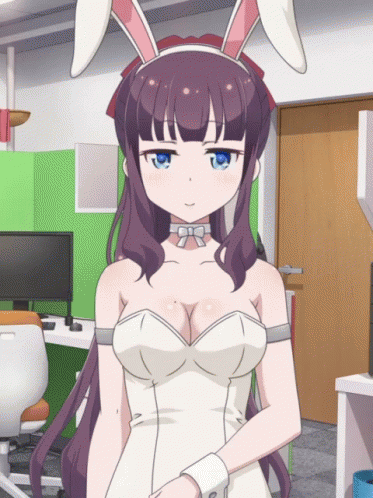 Hifumi Takimoto poses in a white bunny girl outfit with bunny ears and a bow tie choker.