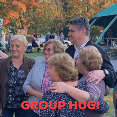 Zoran Milanovic shares a warm group hug with several women at an outdoor event.