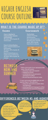 Detailed infographic outlining the Higher English course, including exams, coursework, and summer preparation.