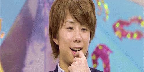 Hiromitsu Kitayama with an amused expression, finger near his mouth, on a colorful set.