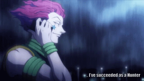 Hisoka from Hunter X Hunter smiles in the rain, stating 'I've succeeded as a Hunter'.