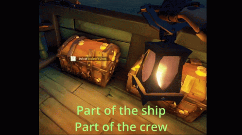 Gameplay footage featuring chests and the iconic phrase 'Part of the ship, Part of the crew', related to Hitbotc Carl.