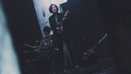 Japanese band Hitorie (ヒトリエ) performs in a dark, atmospheric setting, with a guitarist playing prominently.