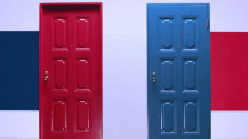 Hitorie (ヒトリエ) member, possibly wowaka, interacts with red and blue doors in a stylized music video setting.