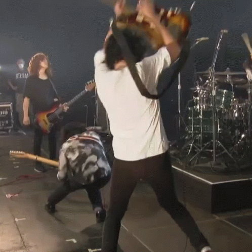 a man in a white shirt is playing a guitar while another man holds a bass guitar