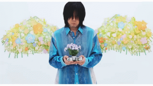a man in a blue shirt is holding a camera and flowers in his hands