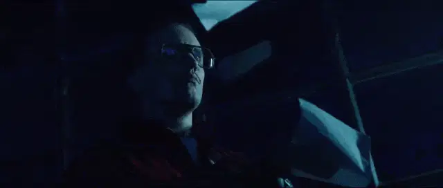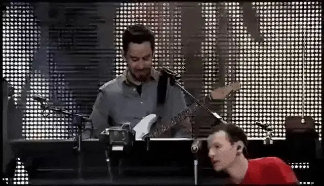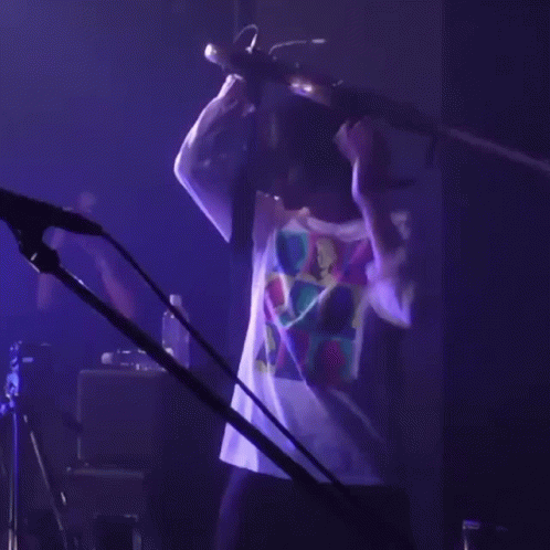 a person playing a guitar in a dark room with purple lights behind them