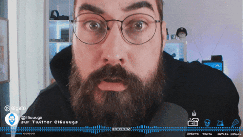Hiuuugs, a man with glasses and a beard, asks viewers if they are subscribed to his channel.