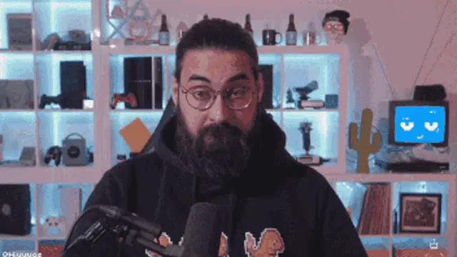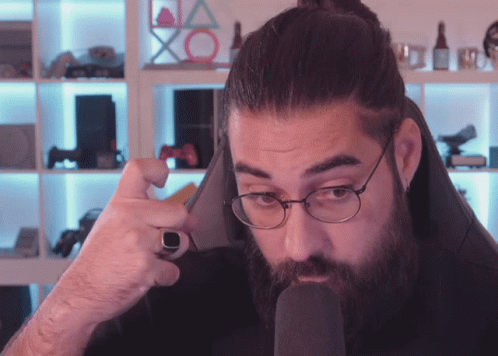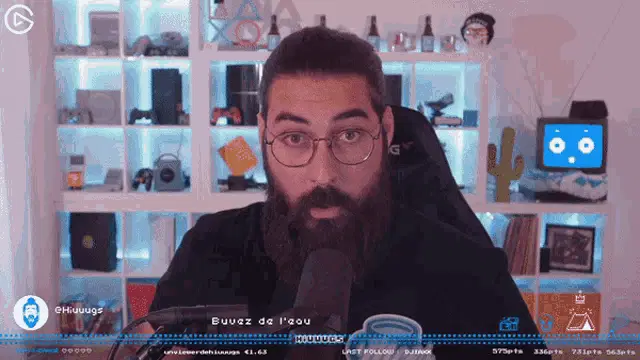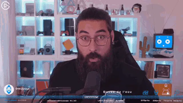 Hiuuugs, a man with a beard and glasses, points to his temple in a 'Big Brain' moment while streaming.