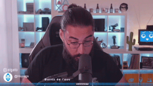 a man with glasses and a beard is sitting in front of a microphone with the words buvez de l' ou on the screen