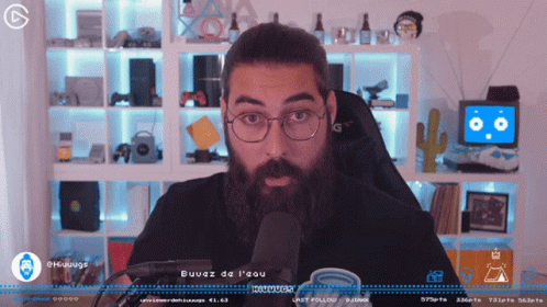 a man with glasses and a beard is sitting in front of a microphone with the words buvez de l' eau below him