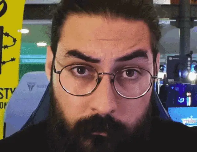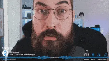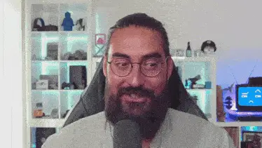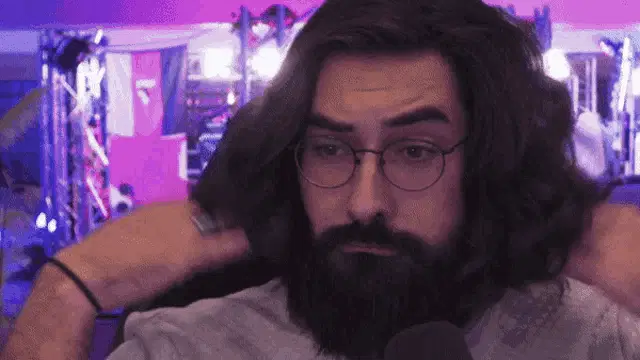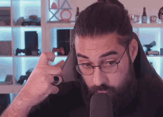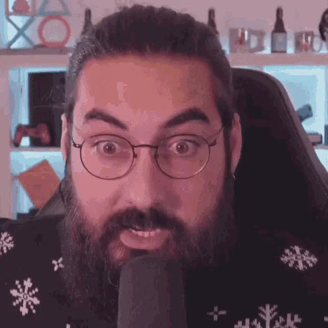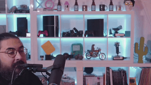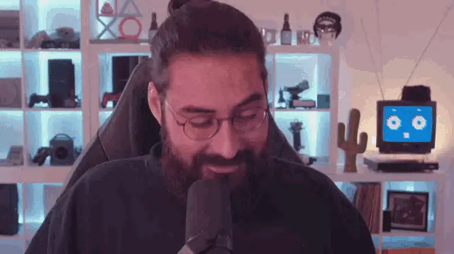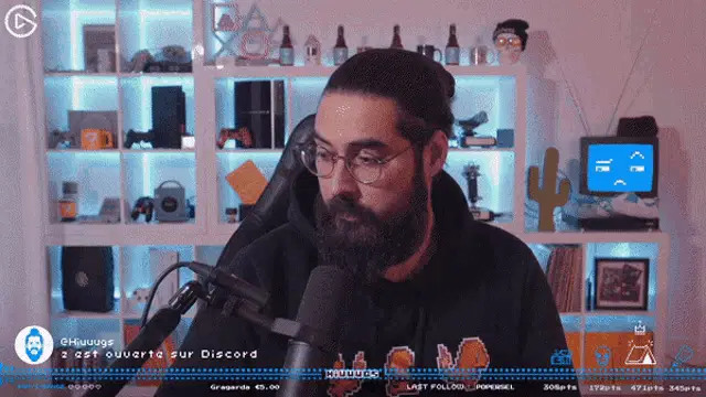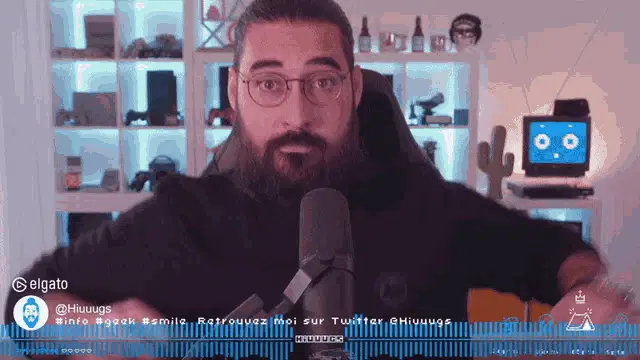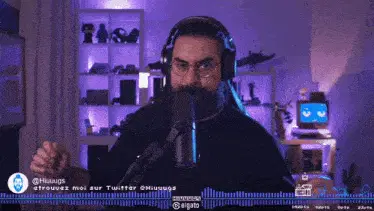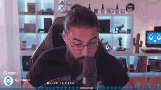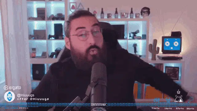 Hiuuugs Hiuuugs Salédu Q: Man with glasses talking into microphone, surrounded by gaming setup.