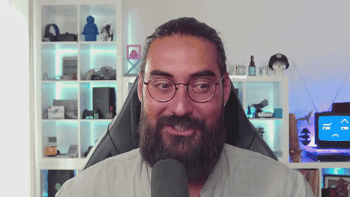 a man with glasses and a beard is sitting in front of a microphone in a room