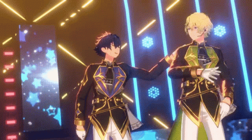 Hiyori Tomoe and Jun Sazanami from Ensemble Stars perform a synchronized dance on a brightly lit stage.