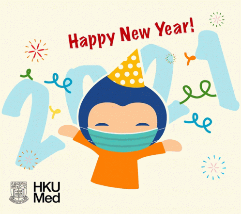 Animated greeting from HKU Med for 2021, featuring a character in a mask and party hat wishing 'Happy New Year!'