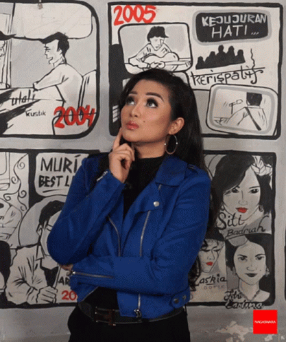 Fitri Carlina in a blue jacket, pondering in front of a wall with music-related artwork.