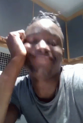 Man in a grey shirt making a funny face with his hand resting on his cheek.