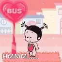 A cute cartoon girl with pigtails stands patiently at a heart-shaped bus stop, deep in thought.