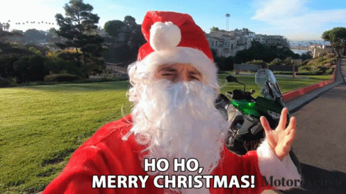 Santa Claus, dressed in his festive suit, wishes everyone a Ho Ho Merry Christmas while standing next to a motorcycle.