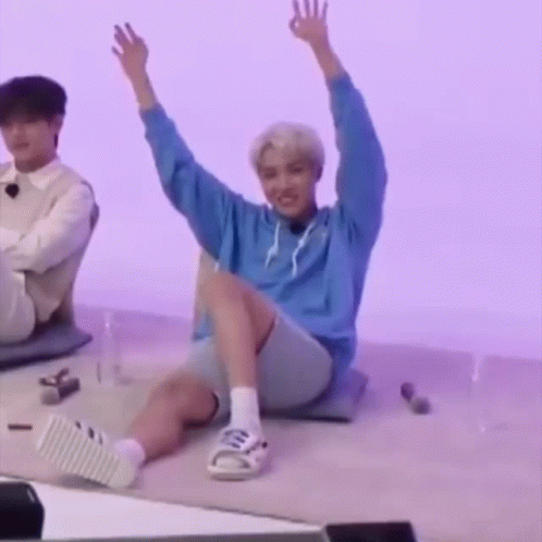 Jhope (Hobi Hoseok) sits on the floor with arms raised, smiling cheerfully in a blue hoodie.