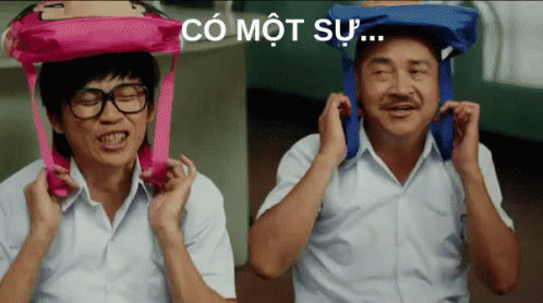 Vietnamese comedians Chí Tài and Hoài Linh in a humorous moment, expressing 'admiration' while wearing unusual hats.